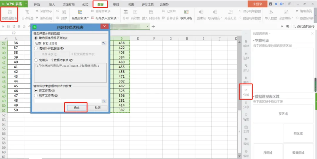 2)点击工具栏中“插入”下的“数据透视表”并点击“确定”;