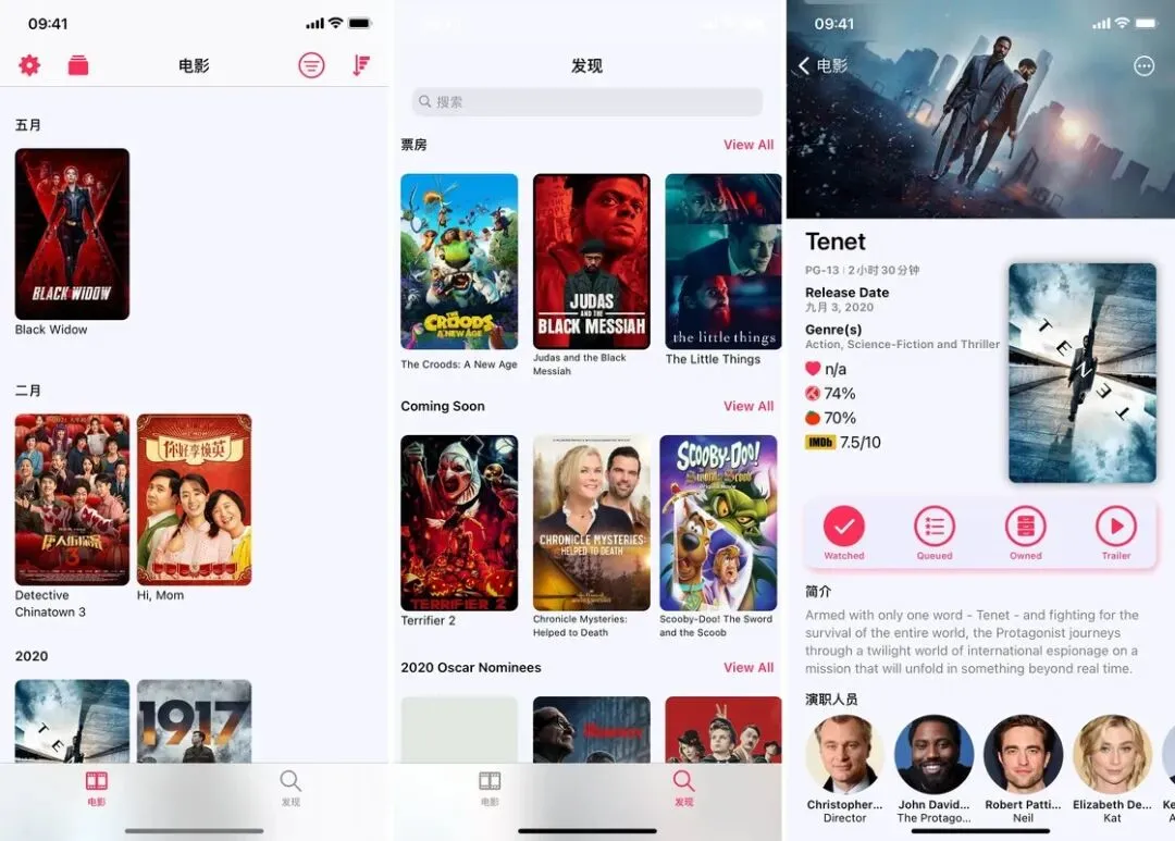 此外,Cinema Time 也支持查看电影的预告片,或是在 IMDB、iTunes(可在设置中修改分区)等平台中打开相关页面,了解更多信息。你也可以在 Cinema Time 的「发现」界面中找到一些精彩电影,提升自己的观影数量。