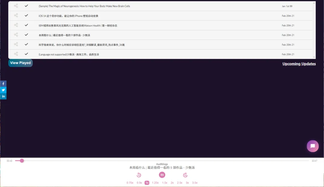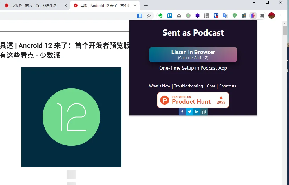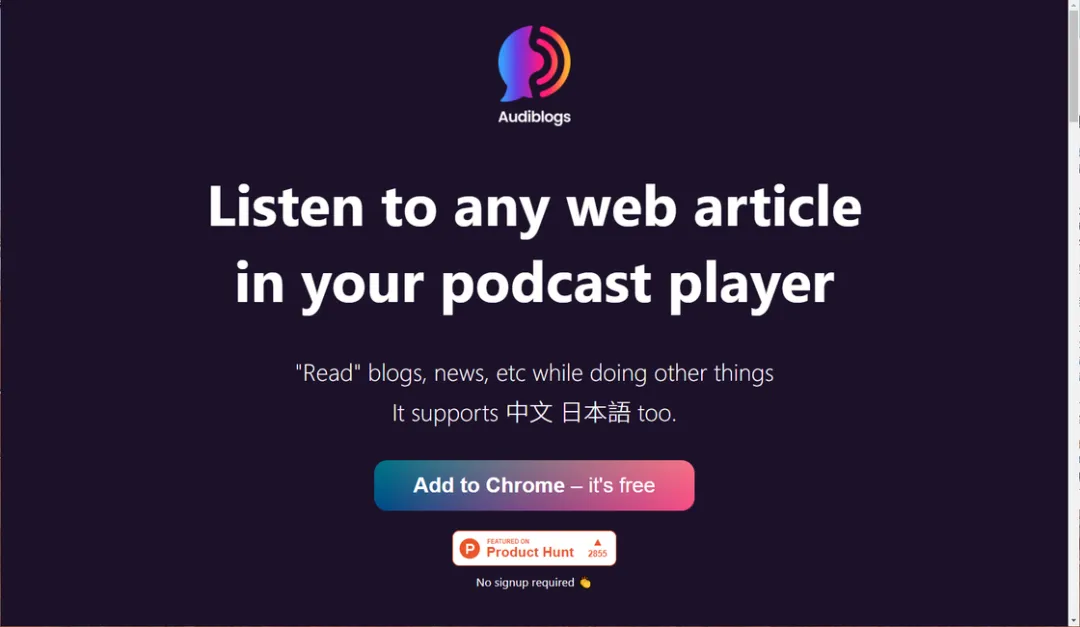 @化学心情下2:在这个快节奏的时代,阅读网页上的内容也变成了一个「耗时」的动作,有时候我们实在不想花上十几分钟来阅读,而是希望可以通过尽可能短的时间甚至碎片化的时间来获取信息,比如通过「耳朵聆听」。所以即便是网页,我们也希望可以通过聆听的方式来快速了解内容,当然市面上也已经有了相当多的扩展或者工具可以实现实时的文字转语音,却一直没有一个可以将网页转成播客的工具——这样通过播客客户端随时收听收藏的网页内容了。而现在这样的工具也已经问世,通过这款名为 Audiblogs 的浏览器扩展,无需注册就可以将当前的网页文字转换成语音,并生成播客订阅地址来通过播客客户端进行播放,除了支持传统英文之外,还支持包括中文、日文这样的东亚语言。而在实际体验中也不难发行,Audiblogs 使用还是很简单的,安装好扩展之后,打开网页点击扩展栏中的「Send to Podcast」按钮,稍微等待一会儿之后,扩展会显示「Sent as podcast」,之后点击下方的「Listen in Brower」后会打开一个网页端的播放页面,你就可以试听到已经全部生成的语音内容了。当然你也可以点击下方的 「One-Time Setup in Podcast App」来生成对应平台支持的播客 RSS 订阅连接,方便你将单集的音频添加到播客客户端中。具体到使用上,首先由于 「Send to Podcast」并非是稍后读应用,因此直接在一些网页上使用会无法生成语音,因此需要先将网页切换到阅读器模式,然后再点击「Send to Podcast」才能正常生成语音,其次就是语音合成引擎上,英文相对比较自然,而到东亚语言上,尤其是中文明显属于机械音,如果可以进一步选择不同的语音合成引擎效果会更好。总的来说,Audiblogs 可以说是一款相当有趣的工具,尤其适合希望利用碎片化通勤时间来进行信息获取的朋友,看网页变得浪费时间,那么听语音也许是更便捷的一种获取信息的手段。