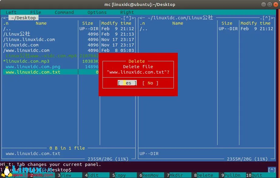 ENTER键确认后,您将在活动面板中看到一个新文件。现在,我们不使用任何命令就删除该文件。使用箭头键,按UP或DOWN,直到命名的 www.linuxidc.com.txt