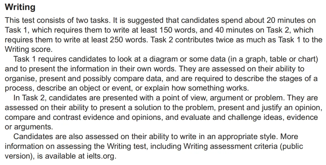 写作部分还是包含了两个板块,分别是大作文和小作文,小作文按照要求150字,完成时间20分钟;大作文按照要求250字,完成时间40分钟,大作文涉及的题型涵盖了15个大类。