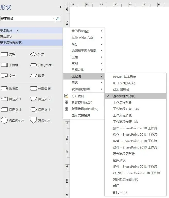 用Visio做基本流程图时的界面如下图所示,从图中我们不难发现列表中对于基本流程图形状的分类显得更为清晰和直观,该软件利用可视化方式为制作流程图的用户提供了便捷,节省了很多时间。