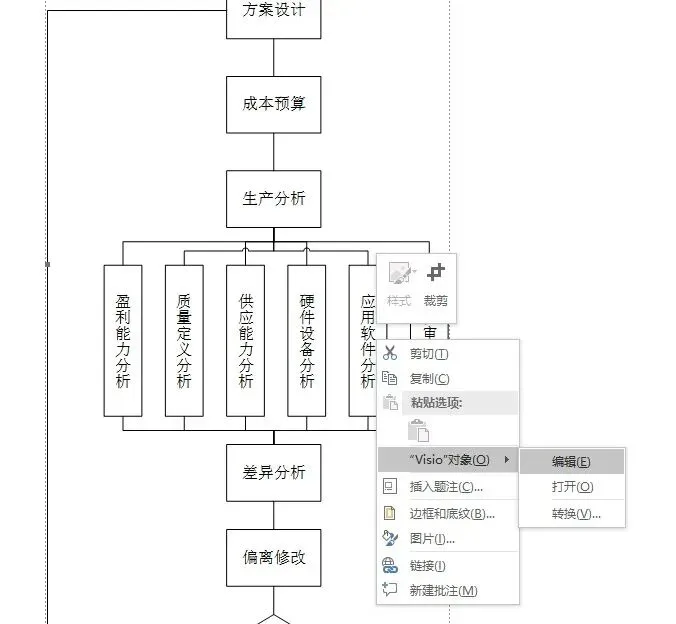 2)如下图中选中流程图,右键菜单中选择【“Visio”对象】中的【编辑】,便能在Word中调整通过Visio制作出来的基本流程图啦!