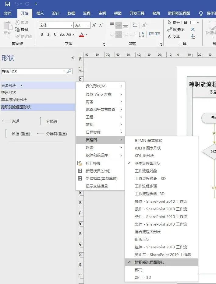 那么一个跨职能流程图该怎么画呢?这与上一个基本流程图一样,都是通过系统本身存在的图形形状来完成。如下图所示,在【更多形状】的下拉选项中选择【流程图】,再选择【跨职能流程图形状】,便能自如选择想用的跨职能流程图形状来绘制跨职能流程图啦!