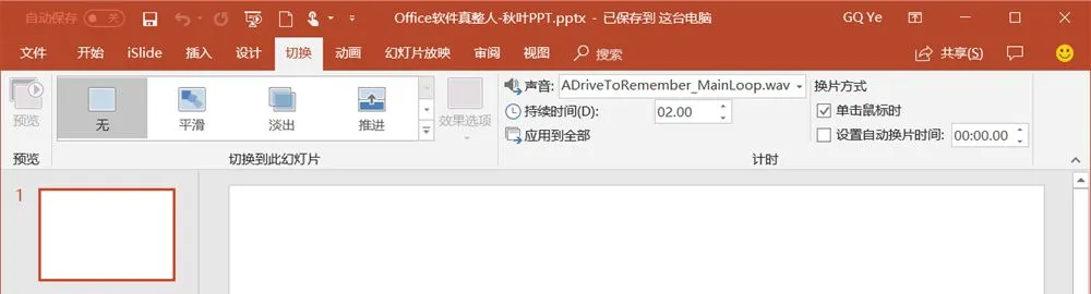 设置背景音乐,不止插入音乐一种方式,在【切换】选项卡中,还有一个设置声音的地方,可以将 wav 格式的音频插入到这里作为背景音乐。
