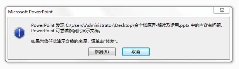 从网上下载的 PPT,双击打开弹出这么个提示,点击修复也没用。