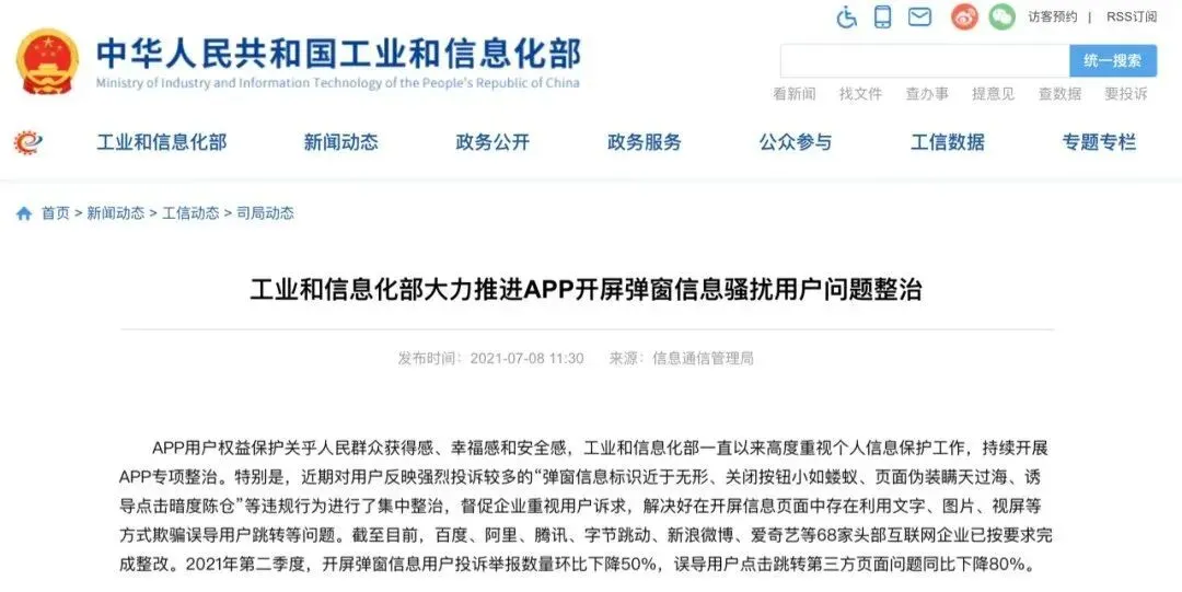 按照工信部的公告,2021年第二季度,开屏弹窗信息用户投诉举报数量环比下降50%,误导用户点击跳转第三方页面问题同比下降80%。