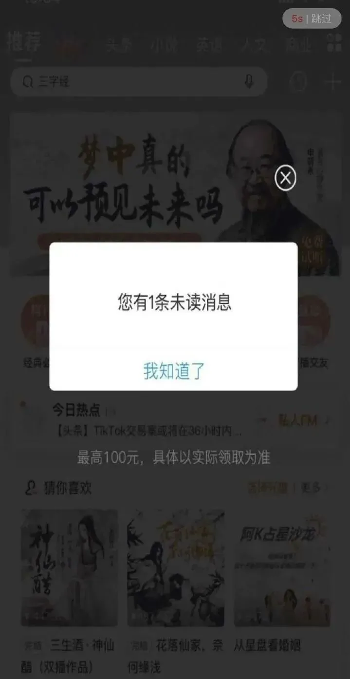 为了让使用者观看广告,部分手机App在开屏广告出现后并没有“跳过”按钮,需要过几秒后“跳过”按钮才会出现。