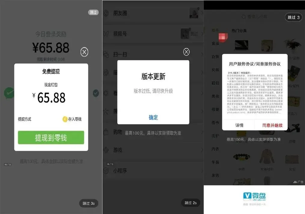 有一些开屏广告还会“伪装”成微信零钱提现、微信红包、用户协议签订界面、手机网络设置、未读消息、版本更新、无网络服务提示、权限申请等消息提醒,诱骗点击。