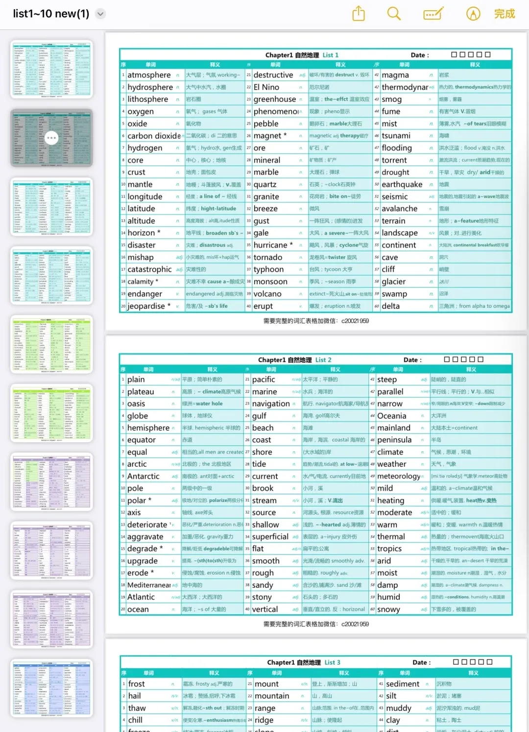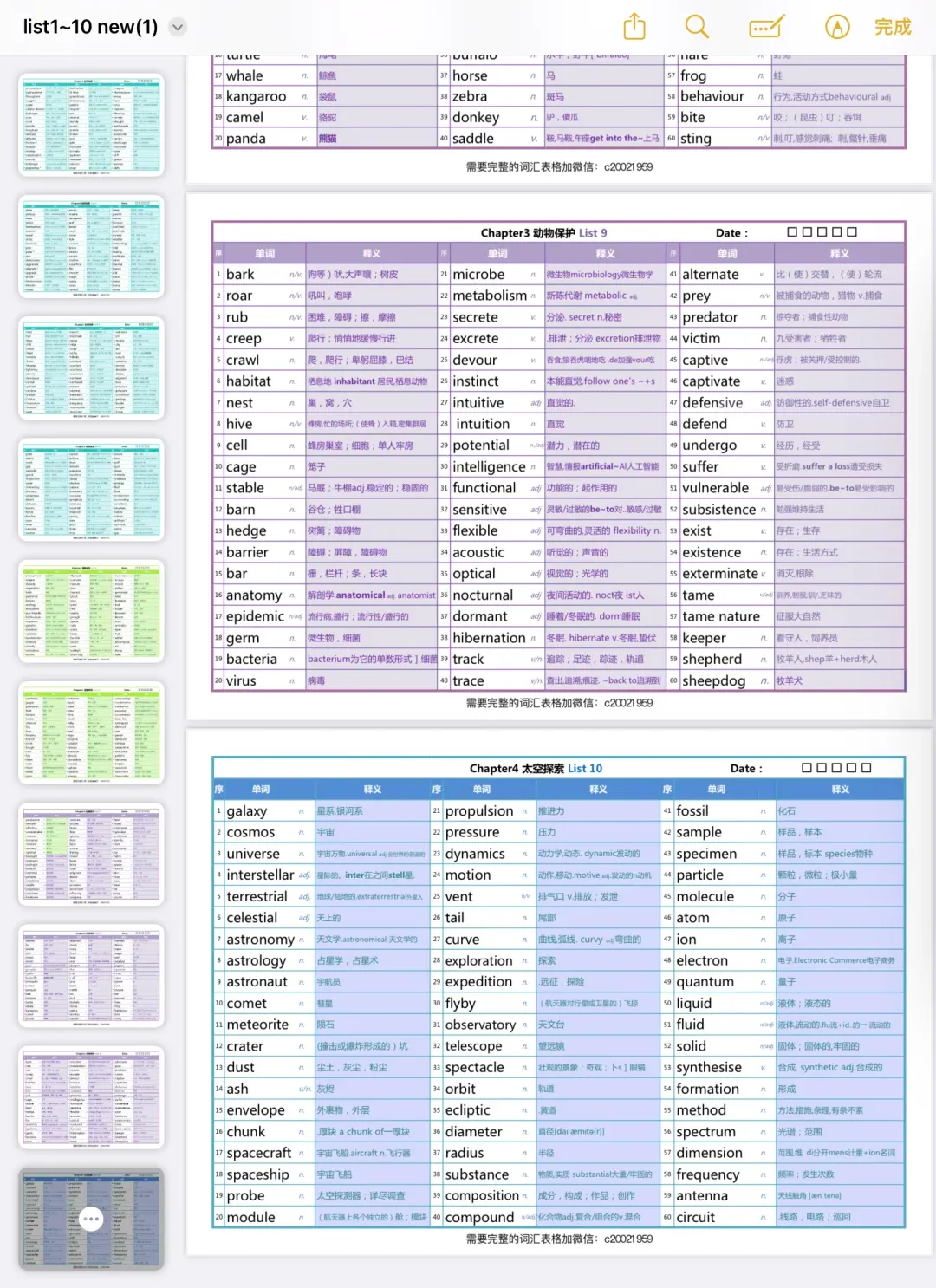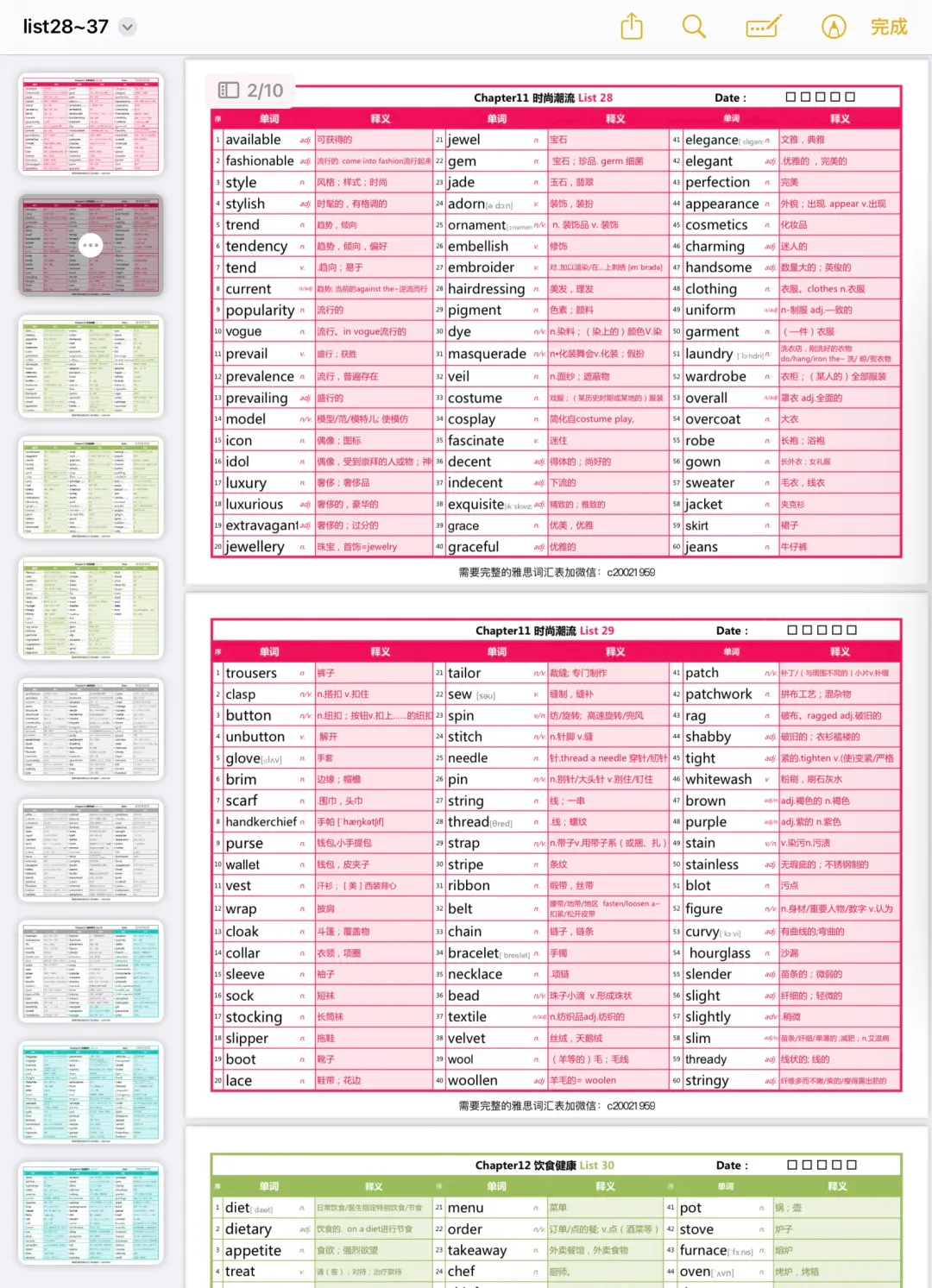 色彩搭配简直是绝绝子!一共有56页词汇,10个List,比起在书上的密密麻麻单词,这种利用颜色列出来的确实会让我们更加高效备考,同样在记词的时候也不会感到枯燥。
