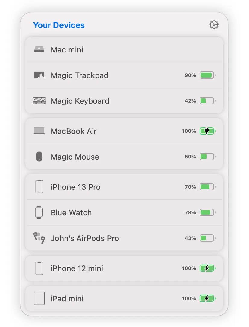 不仅支持 AirPods、Beats 等无线耳机,其他苹果系外设也同样支持,比如能展示苹果鼠标、触控板、手表的电量。