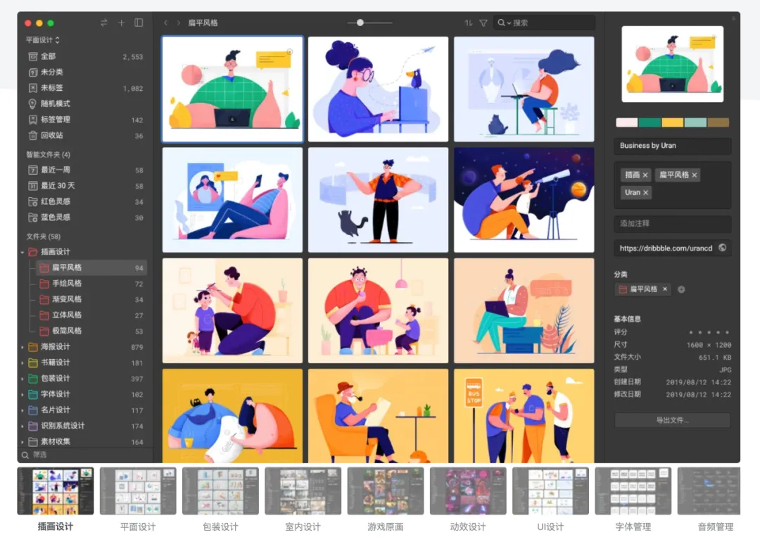可通过浏览器扩展、视频书签、截图、拖放、粘贴等方式迅速将素材保存到 Eagle 资源库,支持 70 多种文件格式。使用标签、文件夹、智能文件夹等方式快速分类整理素材,并可根据关键字、标签、颜色、形状、格式等条件快速查找你需要的素材。
