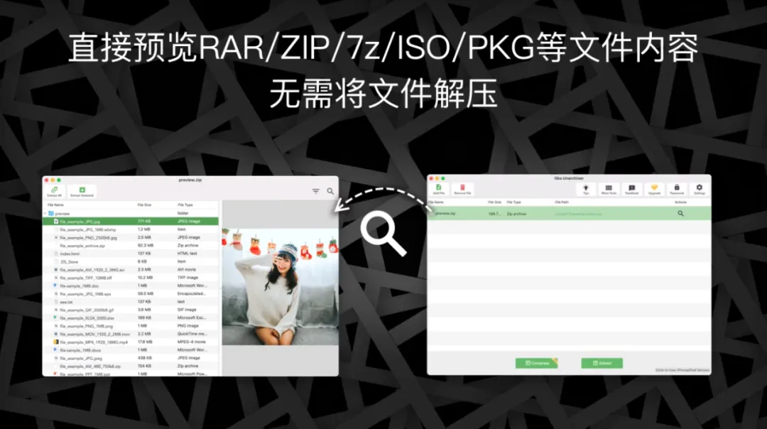 支持 RAR、7Z,ZIP,TAR,GZIP,BZIP2,XZ,LZIP,ACE,ISO,CAB,PAX,JAR,AR,CPIO等格式的解压,支持 ZIP 压缩。可以一键批量解压,压缩包内容预览,带密码解压/压缩,支持分卷解压/压缩。