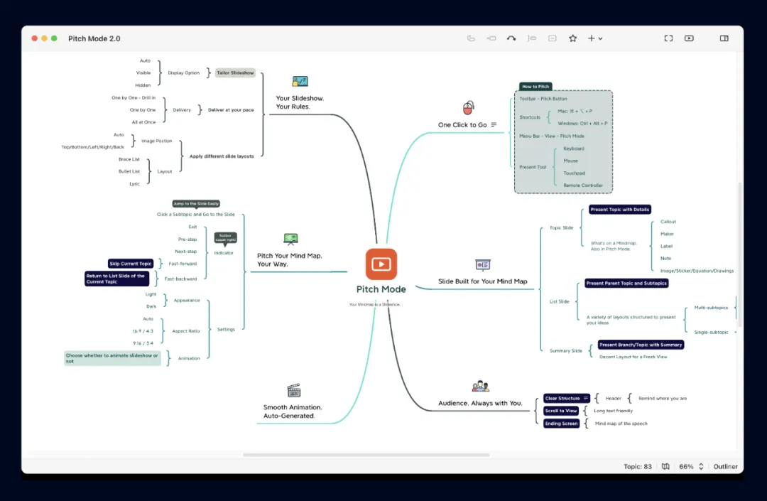 新的演说模式,可自动生成优雅的排版和转场动画,像播放 PPT 一样展示思维导图。