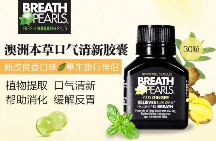 Breath Pearl 口气珠,采用纯天然材质,其中包括:丰富的薄荷提取物(排除肠胃气体、缓解肠胃不适)与西芹籽油(具有强吸附性,是保持口腔口气清新的法宝,被称为天然的除臭师)提炼而成,有了这样的组合,即可以排除肠胃里积攒滞留的气体,而这些气体正是口臭的根源所在。。。