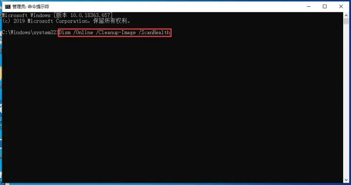 2、接着在命令提示符界面内输入“Dism /Online /Cleanup-Image /ScanHealth”命令,这一步的目的是扫描系统文件检测是否存在问题。