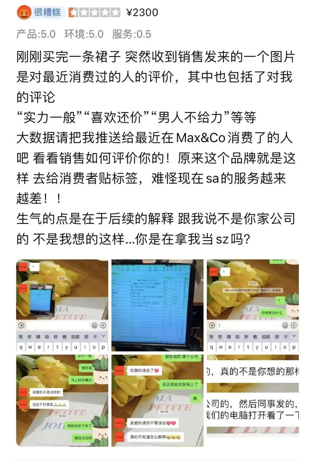 “大数据请把我推送给最近在MAX&Co消费了的人吧,看看销售是如何评价你的!原来这个品牌就是这样,去给消费者贴标签,难怪现在销售的服务越来越差。”
