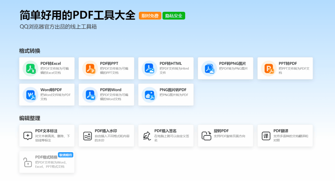 它支持 PDF 转换工具,包括:PDF 转 Excel 、PDF 转 PPT 、PDF 转 PNG 、PDF 转 HTML 、PPT 转 PDF 、Word 转 PDF 、PDF 转 Word 、PNG 转 PDF。