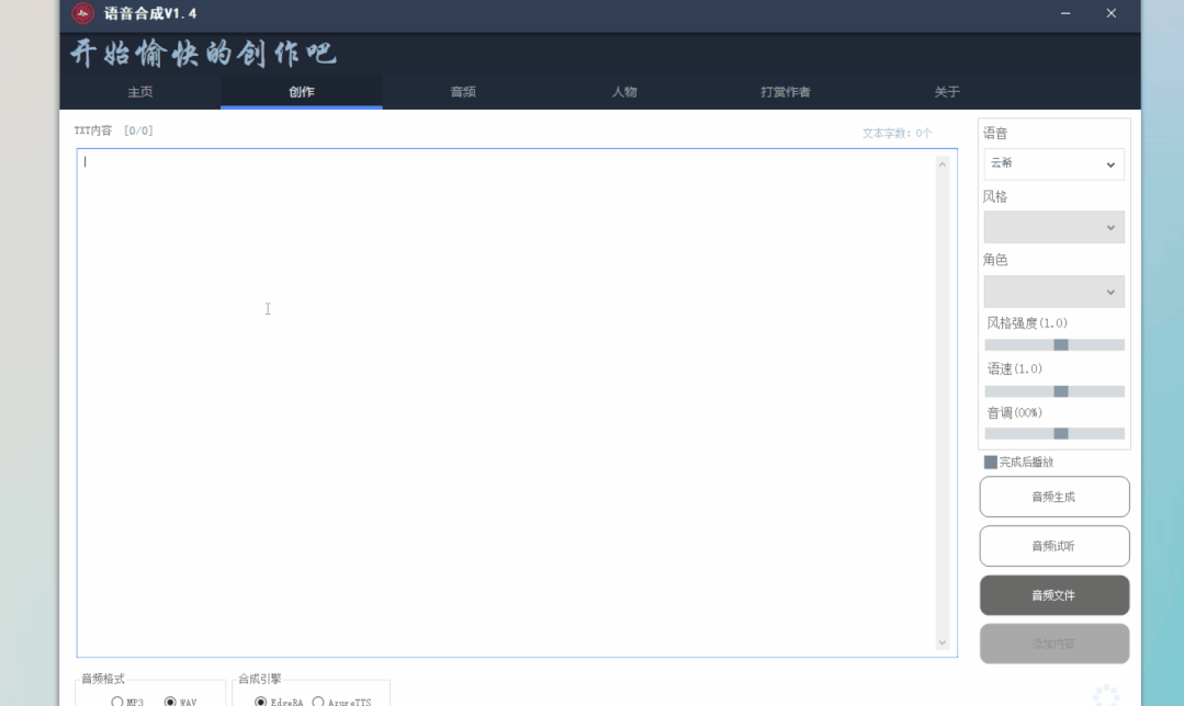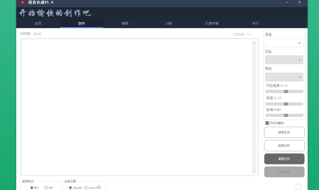 它支持 2 个音频合成引擎,支持几十种发音任意切换,支持设置风格强度、语速、音调;其中 Edge 合成引擎没有字数和时长的限制,几万字的文本也可以生成语音。