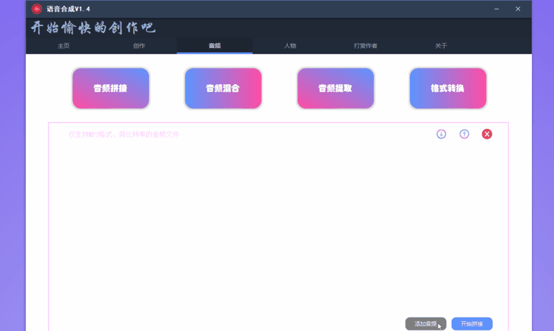 除了文字转音频功能,它还支持人物语音模型板块,可以试听不同人物的语音,支持音频板块,支持的功能包括:音频拼接、音频混合、音频格式转换等。