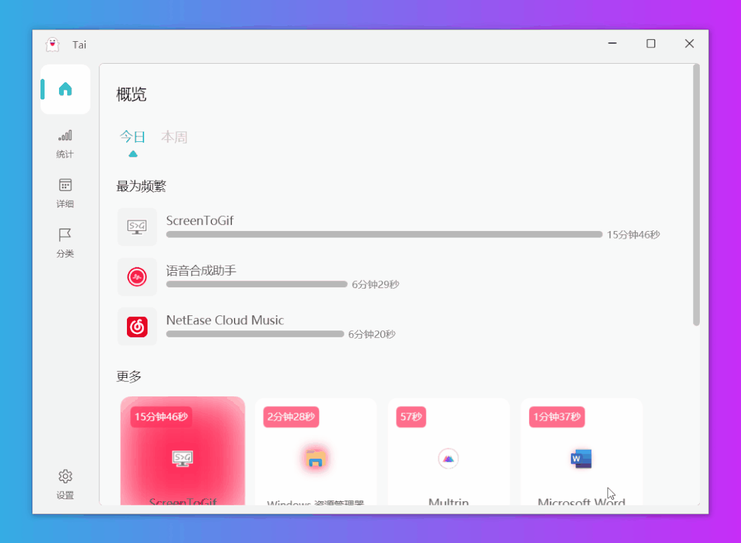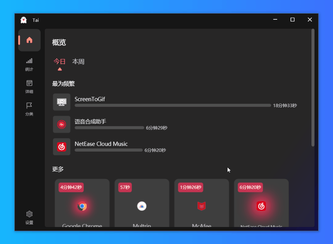 Tai 是一个完全免费的电脑软件使用时长统计软件;软件支持 Windows 。