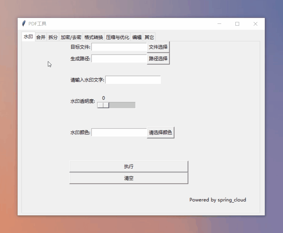 它完全免费,不需要安装,双击打开就可以使用;它简单明了,一目了然,每个功能都是实用并且好用,支持的功能包括:水印、合并拆分、加密解密、压缩优化、格式转换。