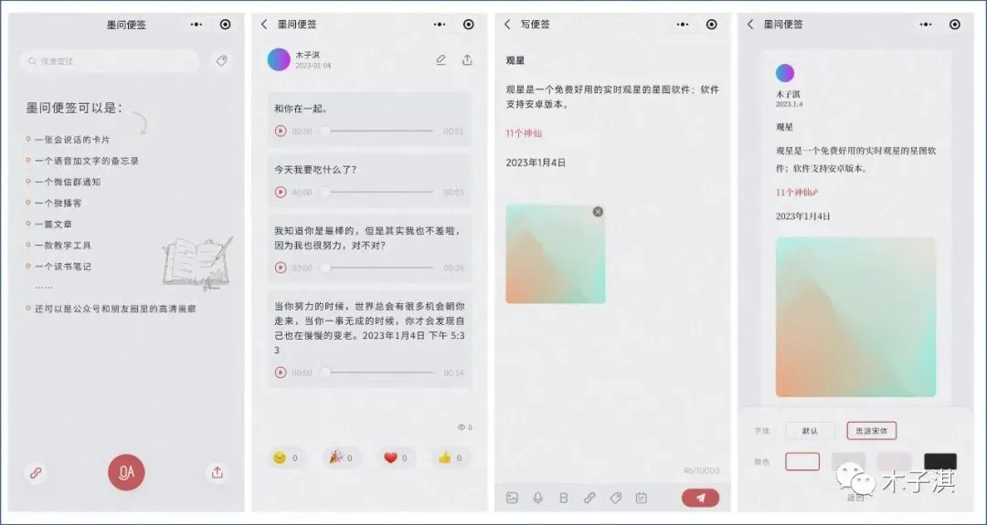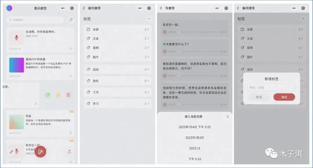 它的一个便签可以包括:文字内容、图片内容、录音音频内容、录音加文字内容、当前日期等。