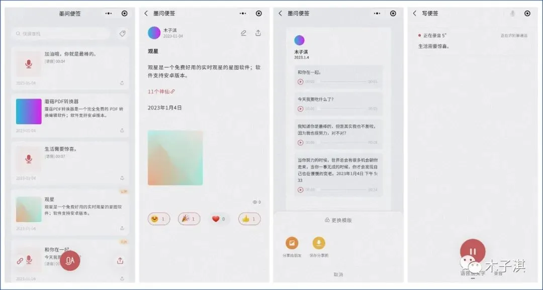 它支持快速便捷的记录事情,进入小程序,长按主界面底部按钮就可以开始语音记录;它支持唯美的图片模板分享样式,支持切换背景颜色和字体。