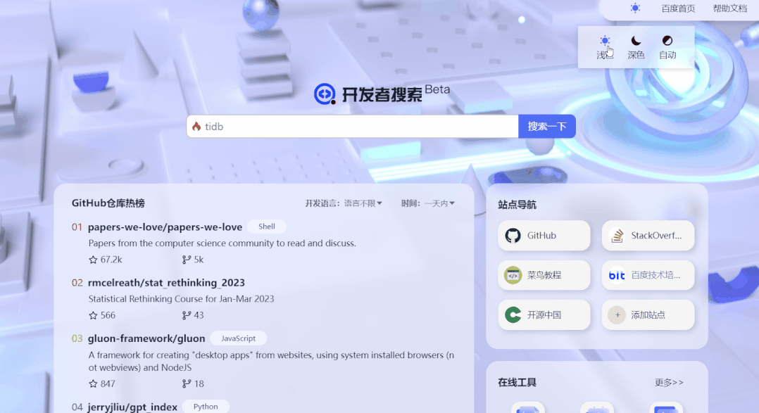 它支持 GitHub 仓库热榜,支持选择开发语言和时间,支持站点导航和多个实用编程工具;它支持多种搜索场景,支持多种搜索结果选项,支持对喜欢的结果进行收藏管理。