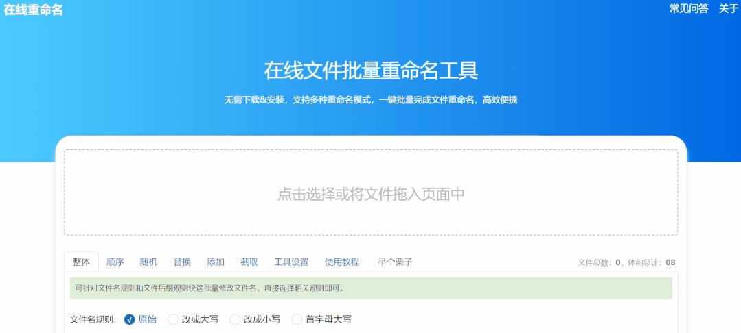 它完全免费,所有文件数据都在本地浏览器处理,支持文件重命名实时预览,所见即所得;它简单实用,便捷易用,不需要下载安装,不需要注册登录,没有使用限制,用完即走。