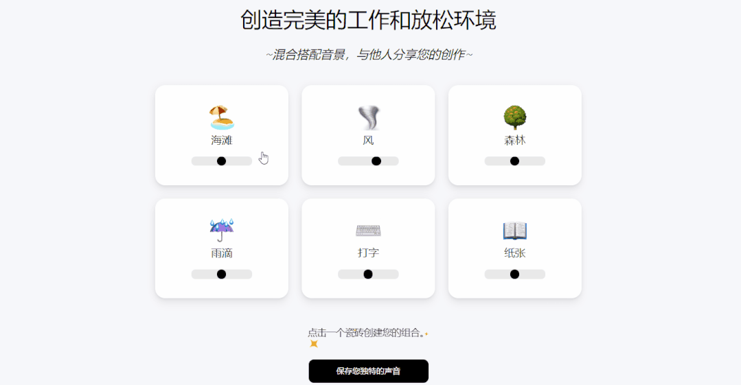 它完全免费,支持 6 种白噪音任意组合,包括:海滩、风、森林、雨滴、打字、纸张,每一种白噪音都是悦耳舒适。