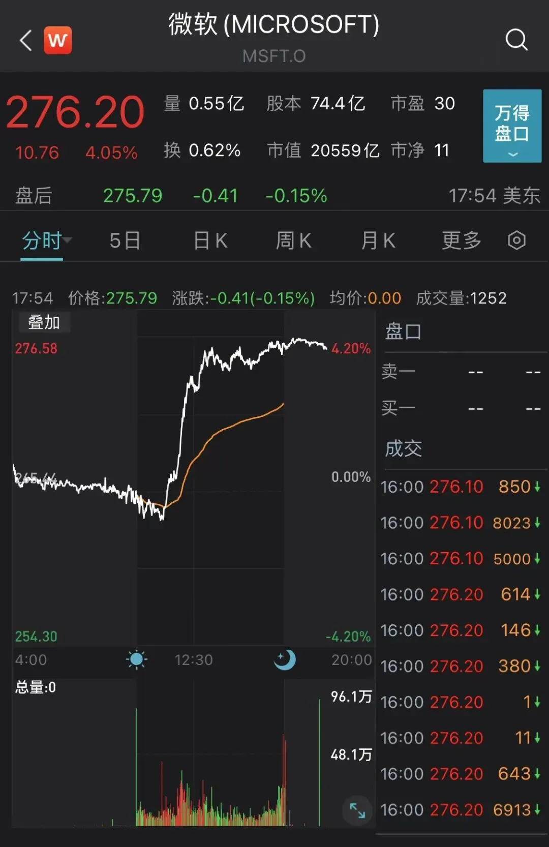 发布会结束后,微软股价涨幅不断扩大,总市值重回2万亿美元。截至美股收盘,微软报276.2美元/股,大涨4.05%,总市值为20559亿美元。
