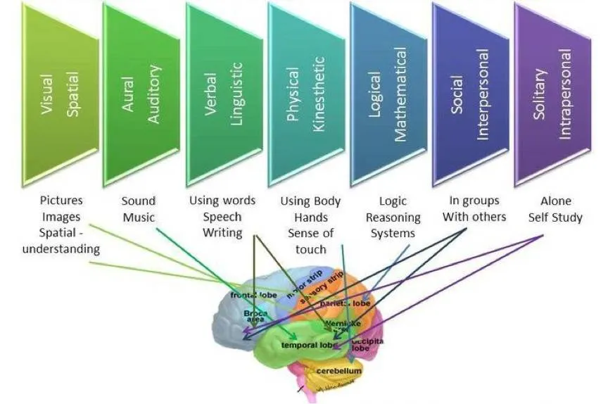 第一行:视觉和空间,听觉,口头表达,身体运动,逻辑数学,人际社交,自我内在