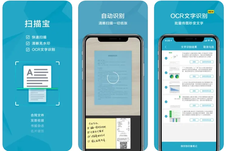 扫描宝,免费扫描App,清晰快捷扫描所有纸张。自动扫描模式下,不用动手,瞬间把合同文件、书刊、发票收据和名片等一切纸张,清晰装进手机。无水印扫描,整洁好看便于分享。支持 OCR 文字识别。无缝对接印象笔记,资料永久保存。