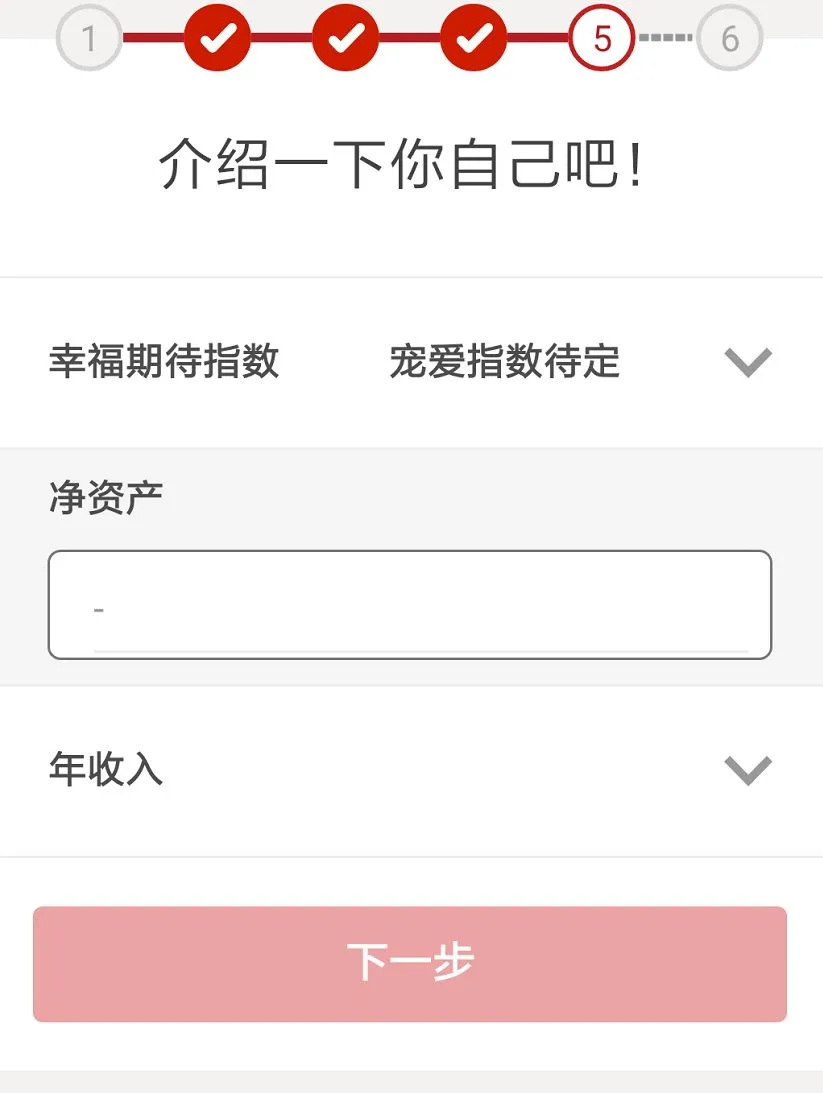 以富豪身份注册时,需要填写一下净资产和年收入,这个选项还是很符合产品定位的。