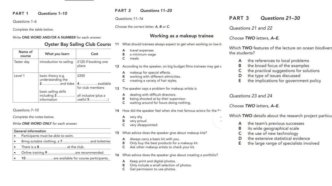 Part1:帆船俱乐部课程咨询,核心题型为10道填空题,场景贴近日常,词汇难度适中,主要考查基础信息捕捉能力;