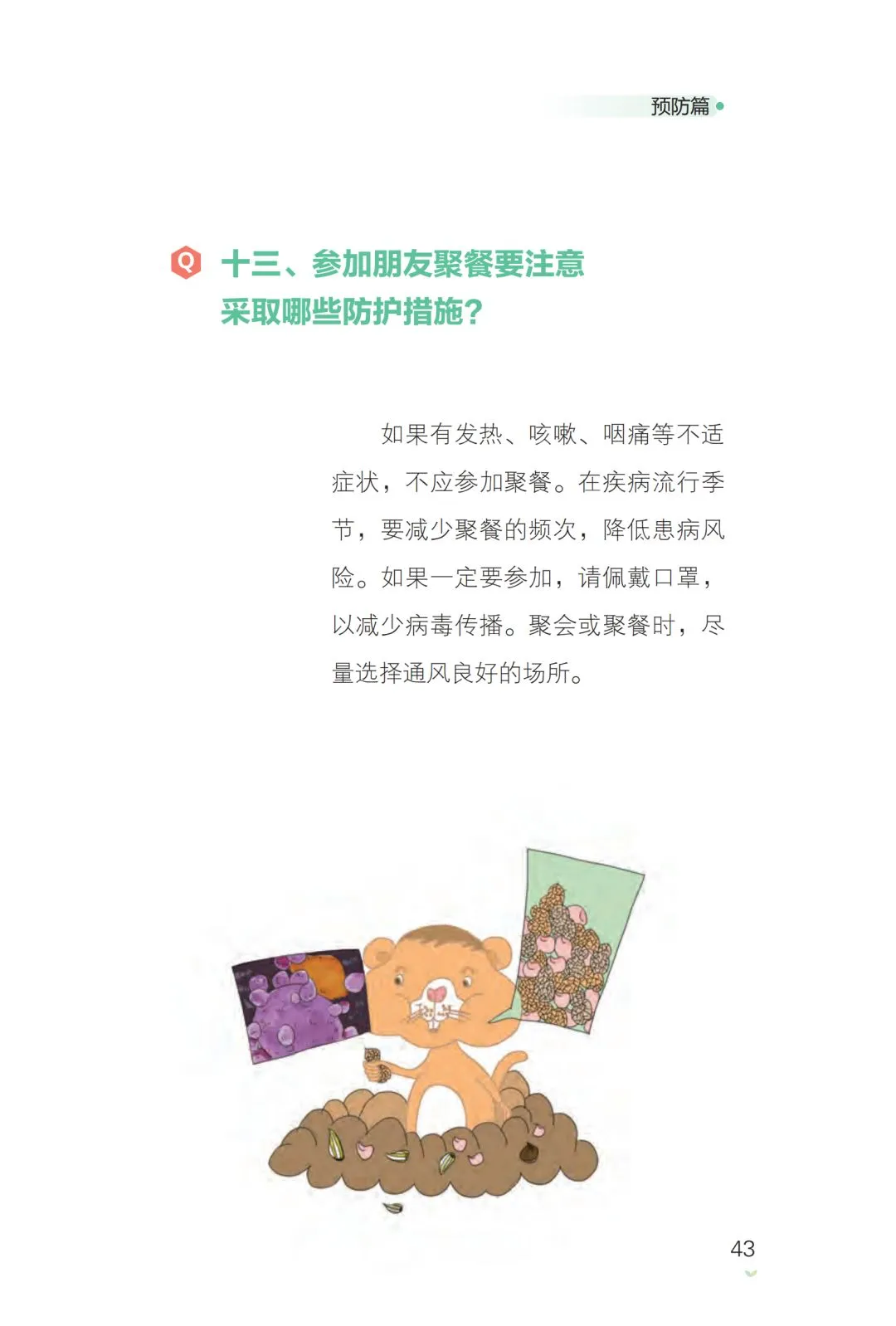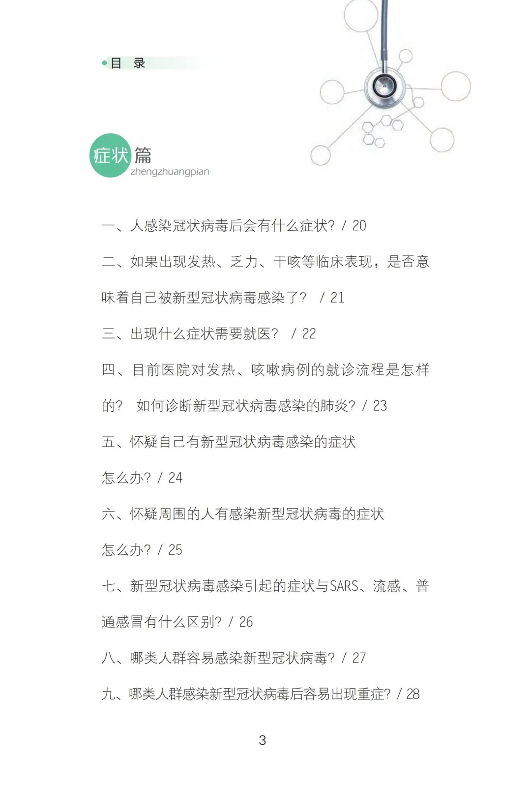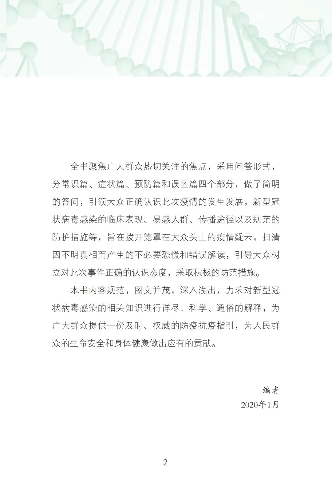 本书是应对新型冠状病毒感染的防护手册,包括常识篇、症状篇、预防篇、误区篇等章节,以问答的形式,详细介绍了该病的可能发病原因、临床表现、自我保护办法、公共场所注意事项及防治误区等内容,对科学防控疫情、普及新型冠状病毒感染肺炎的相关知识有极强的指导意义。