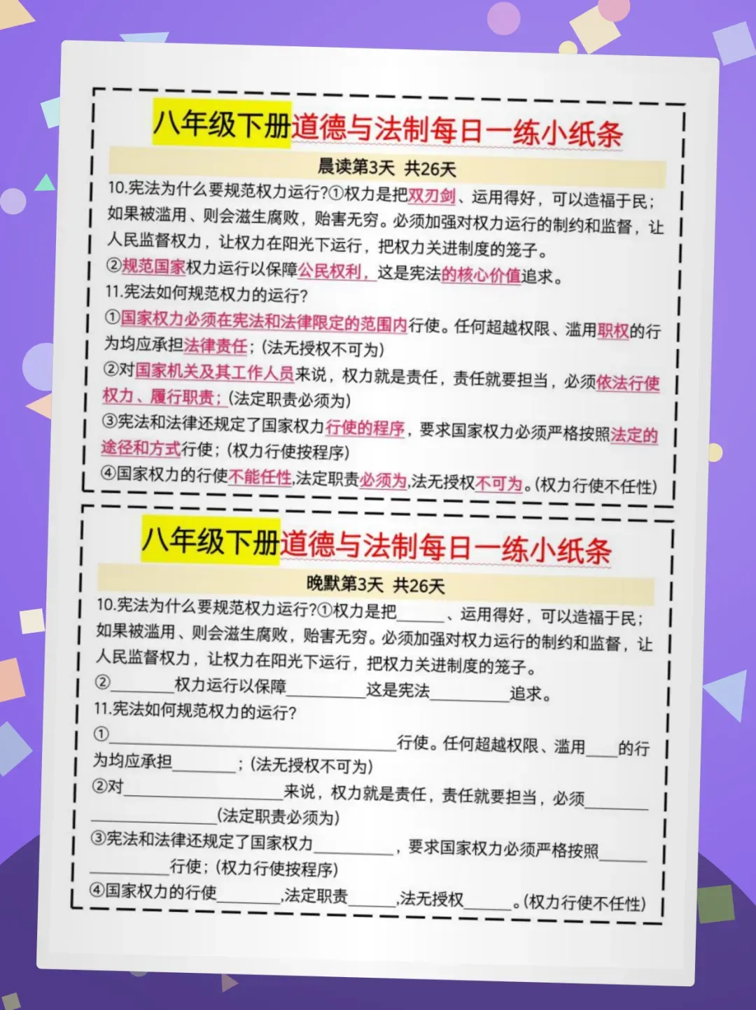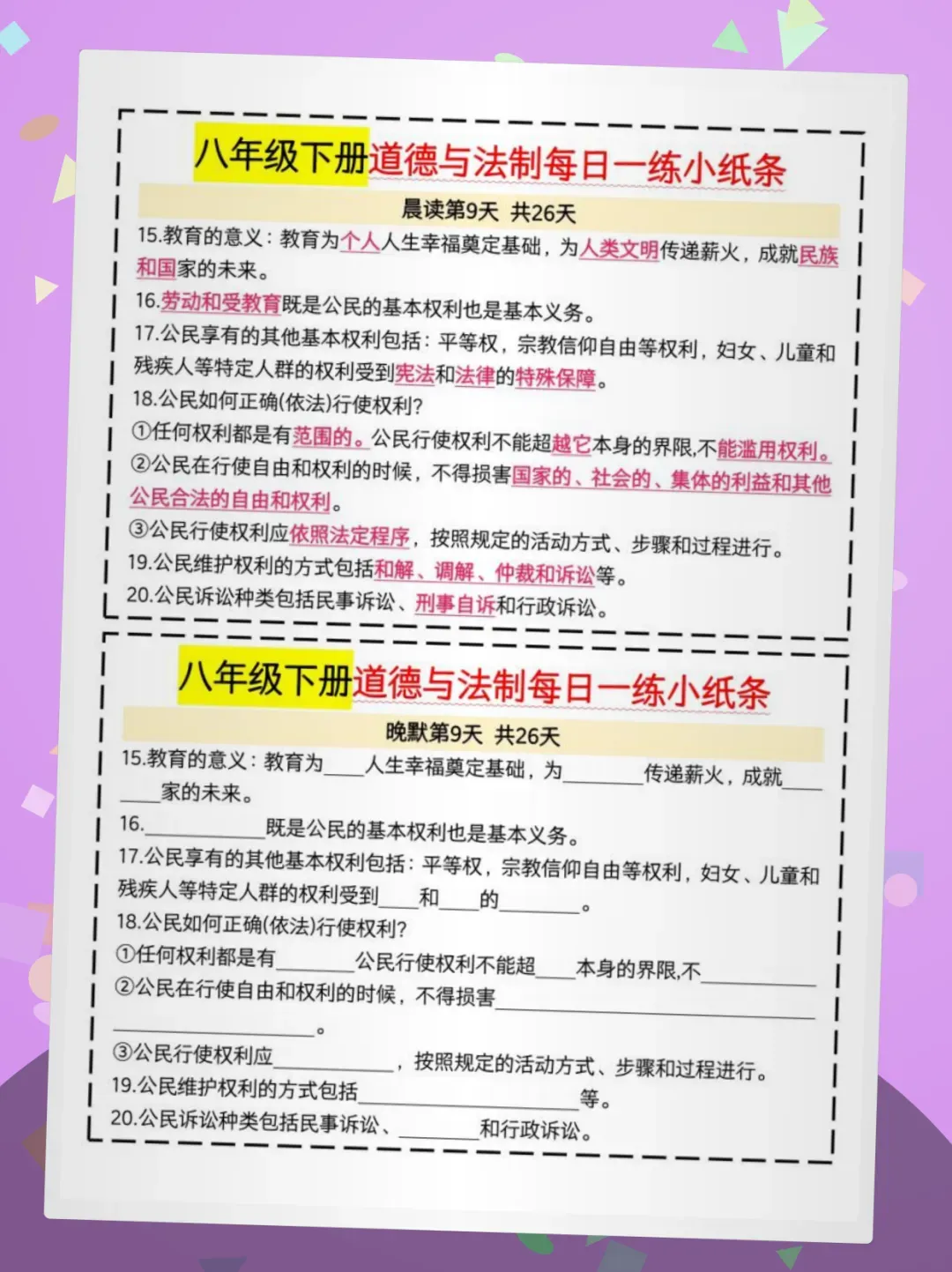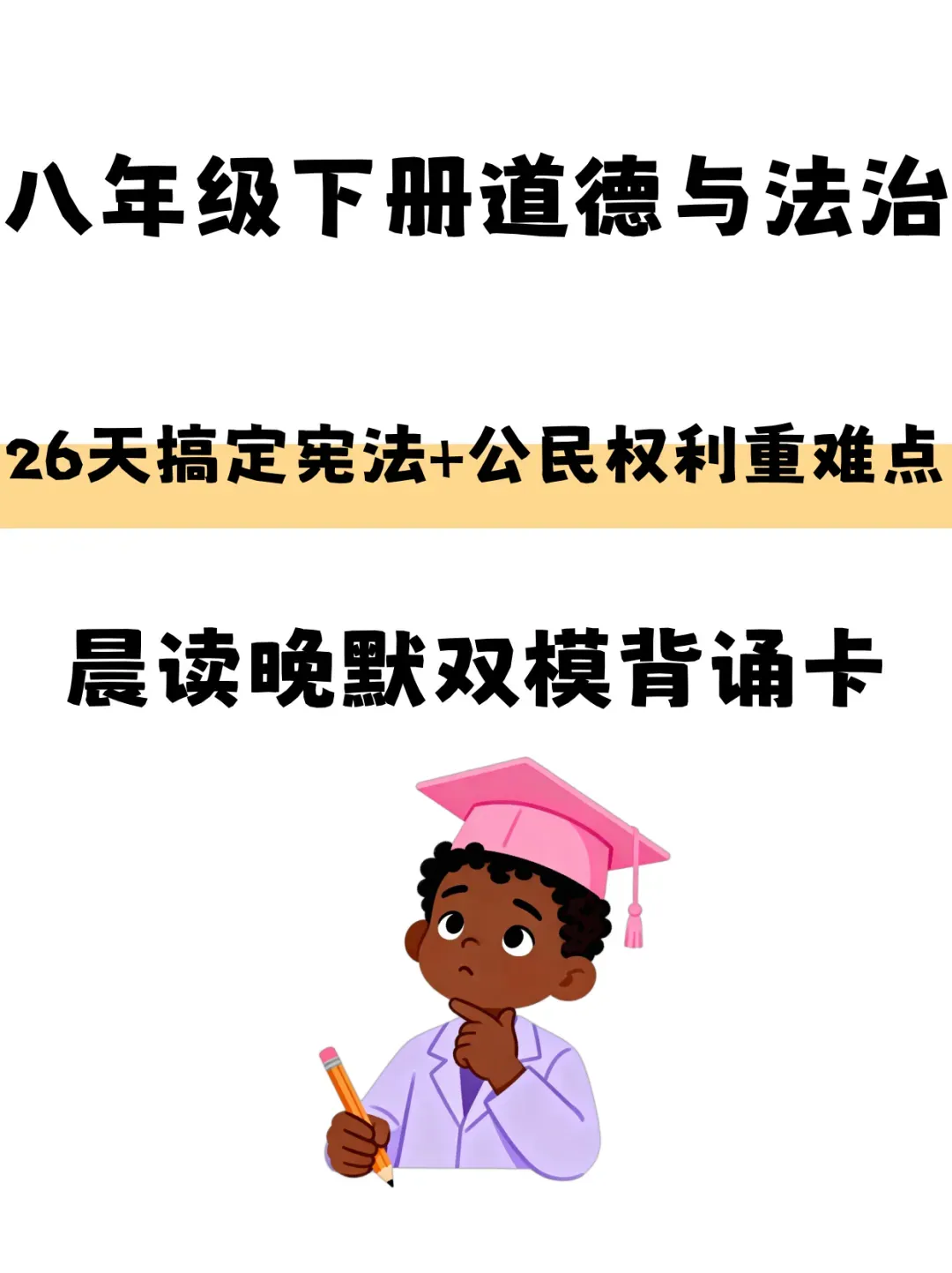 ✅核心亮点:紧扣八下道法教材,覆盖宪法权威、公民权利等5大核心课,每日「展读+晚默」双模式强化记忆,26天系统攻克易混易忘知识点!