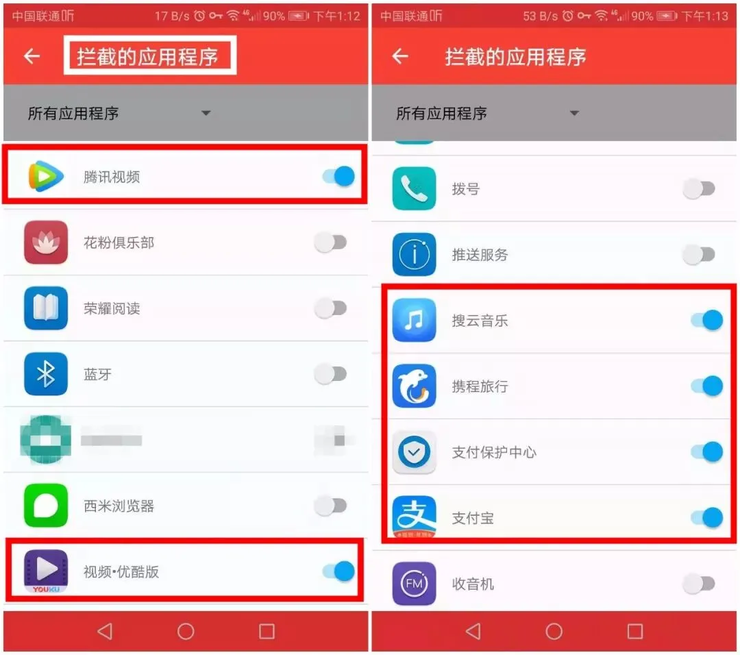 4、点击“广告拦截”→“拦截的应用程序”可以单独设置屏蔽屏蔽哪些APP的广告。(包含网页广告、弹窗广告、视频片头广告等)