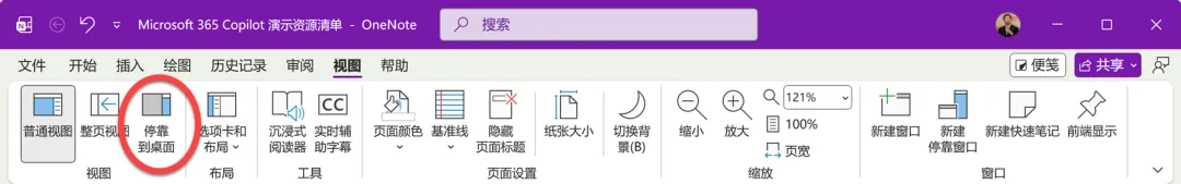 打开 OneNote 笔记页面,执行“视图”选项卡中的【停靠到桌面】命令。