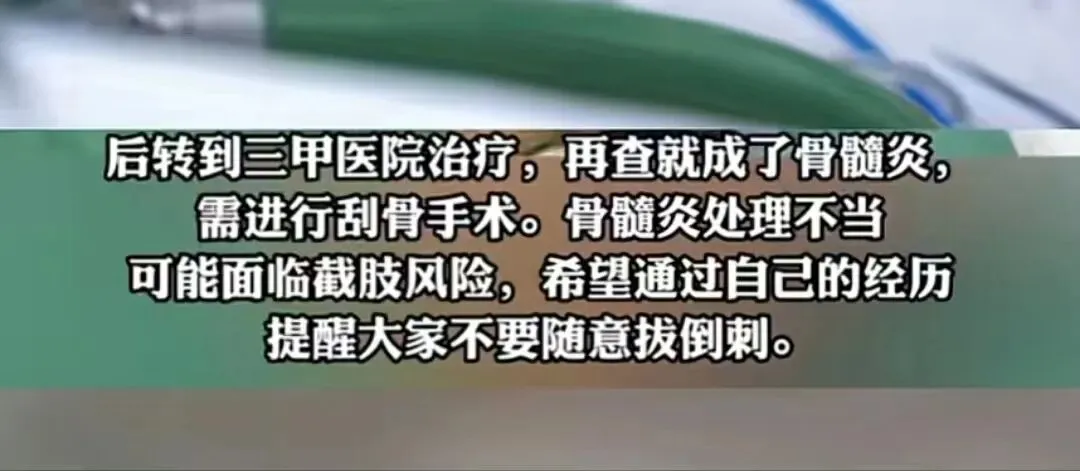 据当事人唐女士称,自从自己拔掉倒刺后,手指就一步步发炎了,虽然及时做了正规处理,但效果欠佳,手指一直在化脓,再查才发现自己得了骨髓炎,需要做刮骨手术。