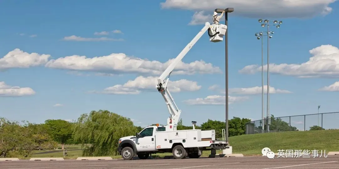 这是因为架设工使用的卡车,通常有着一个可以延伸的桶状物,方便他们进行修理。