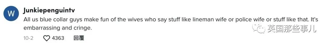 “我们所有做蓝领工作的男性都会取笑那些拿‘架线夫人’或是‘警察夫人’说事的妻子。非常尴尬,也让人反感。”
