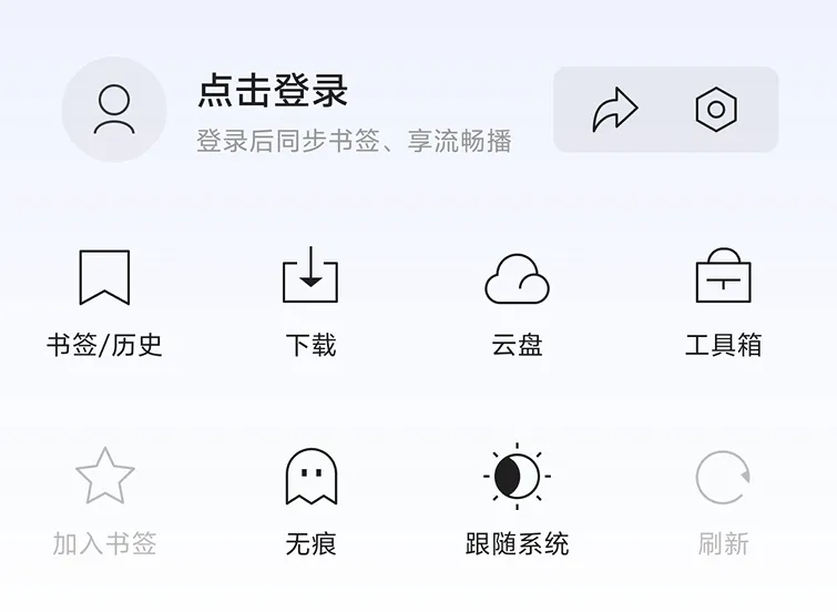 最上方是登录账号按钮、分享和设置按钮。登录后可以进行同步书签、享流畅播。