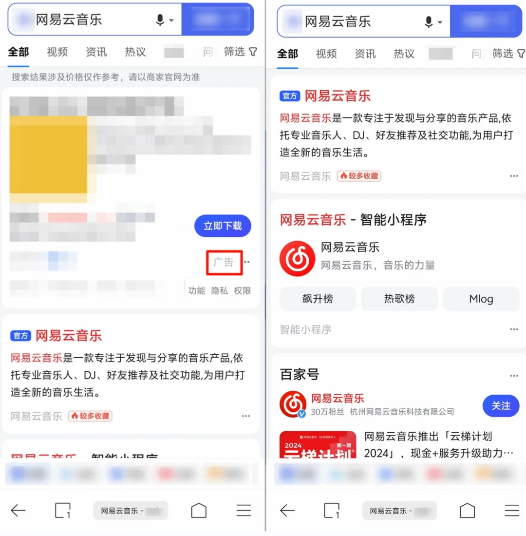 小雷在某搜索引擎搜索「网易云音乐」关键词,开启广告拦截功能后,搜索结果靠前的广告就会被拦截掉。