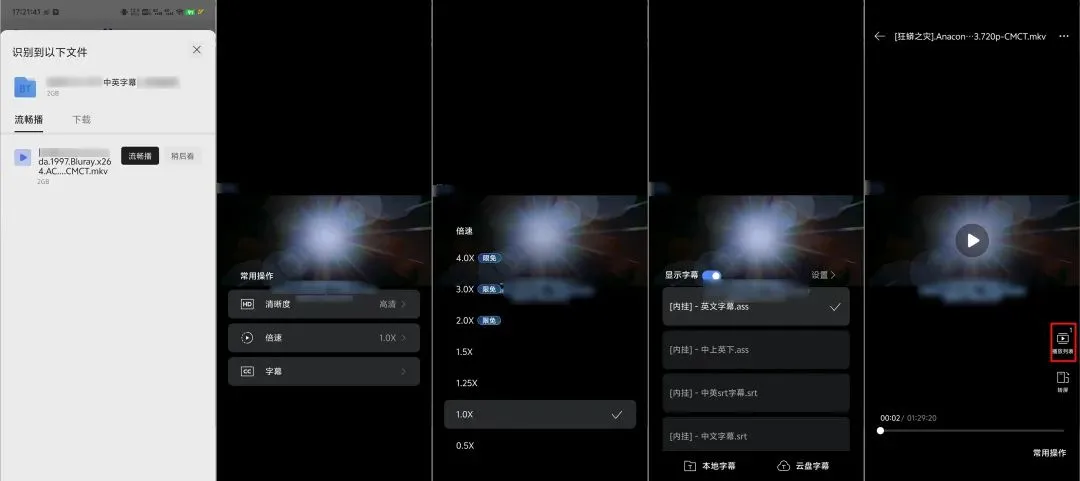 倍速调整从0.5X到4.0X一共7个档位,字幕支持本地字幕和云盘字幕两种显示方式。