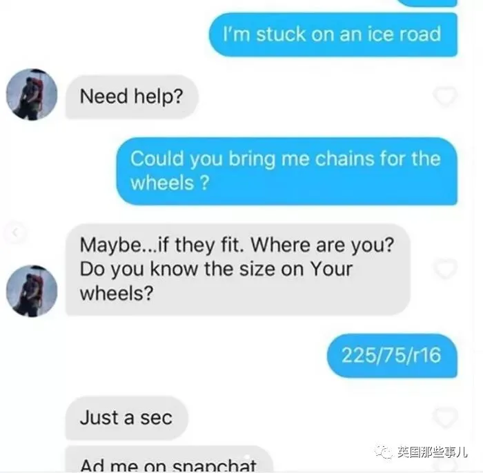 在Tinder软件上,Lonia立刻向他求救,表示被困在结冰的路面上了,