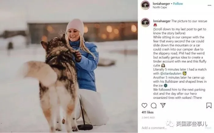 还把这段惊险又幸运地故事po到Ins上,配上几张和Stian的合影。