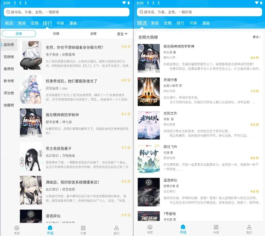 排行榜栏目:这个页面里面有各种各样的排行榜,比如:完结榜、推荐榜、新书榜等等榜单。