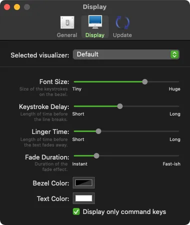 在 KeyCastr 的偏好设置里面还可以设置显示的键盘图标的大小、显示时间、背景颜色、字体颜色等;